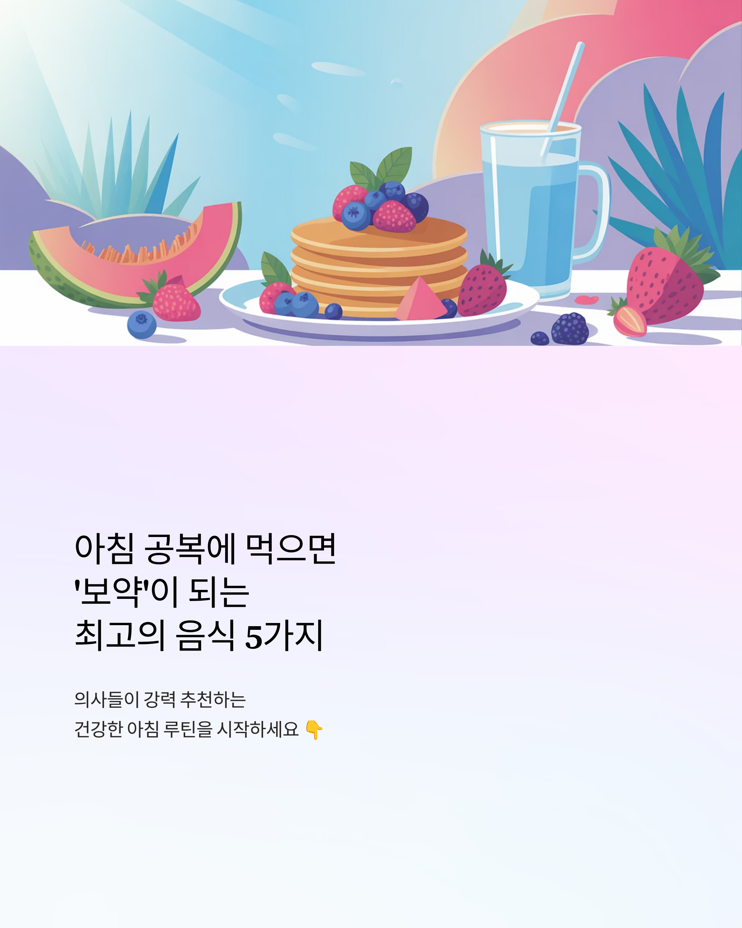 😊"아침밥은 보약이다"라는 말, 다들 아시죠? 하지만 바쁜 일상 속에서 챙겨 먹기 쉽지 않은 것이 사실입니다. 더군다나, 단순히 배를 채우는 것을 넘어 공복 상태의 우리 몸에 정말 좋은 영향을 주는 음식이 따로 있다는 사실!오늘은 의사들이 강력 추천하는, 아침 공복에 먹으면 하루 종일 에너지를 채워주고 건강을 지켜주는 '보약급 음식' 5가지를 자세히 소개해 드릴게요!💡 공복을 깨우는 슈퍼 푸드 5가지1. 기적의 첫 모금, 물 (Water)밤새 자는 동안 우리의 몸은 수분을 잃고 위장 점막은 예민해져 있습니다. 아침에 일어나자마자 마시는 물 한 잔은 이 모든 것을 정상화시키는 기적의 첫 단계입니다.밤새 늘어난 입안의 세균을 씻어내고, 체내 독소를 해독하는 콩팥을 활성화시켜 줍니다.공복 상태의 소화불량이..