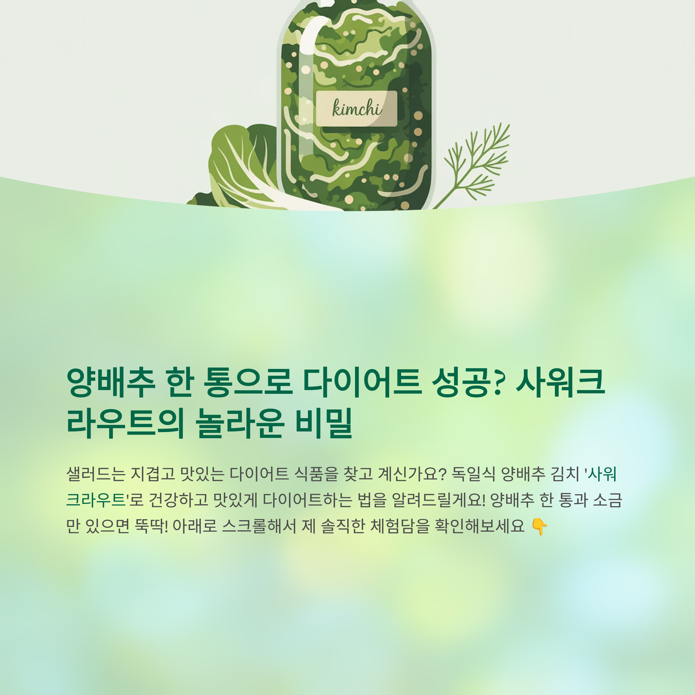 샐러드 말고 좀 더 맛있고 건강하게 먹을 수 있는 게 없을까 고민하다가,**'사워크라우트'**라는 걸 알게 됐어요.독일식 양배추 김치라고 해서 왠지 어렵고 복잡할 줄 알았는데,아니 글쎄 양배추랑 소금만 있으면 뚝딱 만들 수 있더라고요!제가 직접 만들어보고 먹어보니, 왜 다이어트 식품으로 유명한지 바로 알겠더라고요.여러분께도 이 초간단 레시피와 솔직한 후기를 들려드릴게요.사워크라우트, 알고 보니 이런 점이 좋았어요!처음엔 그냥 새콤한 맛이 좋아서 먹기 시작했는데,먹다 보니 몸이 가벼워지는 느낌이 들었어요.다이어트에 최고!: 포만감이 좋아서 식사량을 자연스럽게 줄일 수 있었어요.게다가 장 활동도 활발해져서 속이 정말 편해졌답니다.위 건강에 든든한 지원군: 평소 위가 약한 편인데,사워크라우트를 꾸준히 먹으니 ..