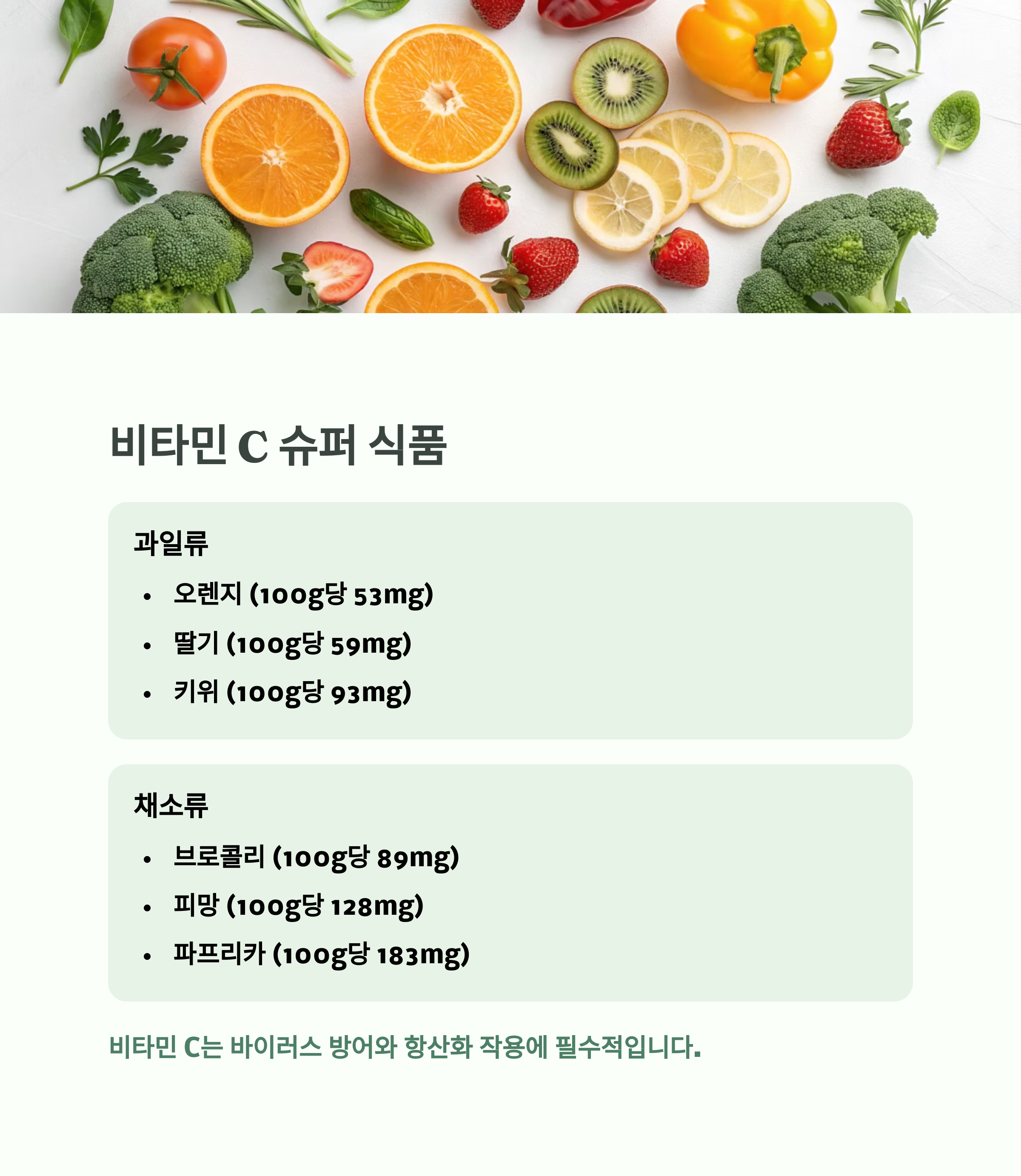 비타민 C는 면역력 강화에 매우 중요한 역할을 합니다. 비타민 C는 백혈구의 기능을 향상시키고, 세포를 보호하는 항산화 작용을 합니다. 비타민 C가 풍부한 음식으로는 귤, 키위, 오렌지, 딸기, 피망 등이 있습니다. 이러한 과일과 채소를 통해 비타민 C를 충분히 섭취할 수 있습니다.