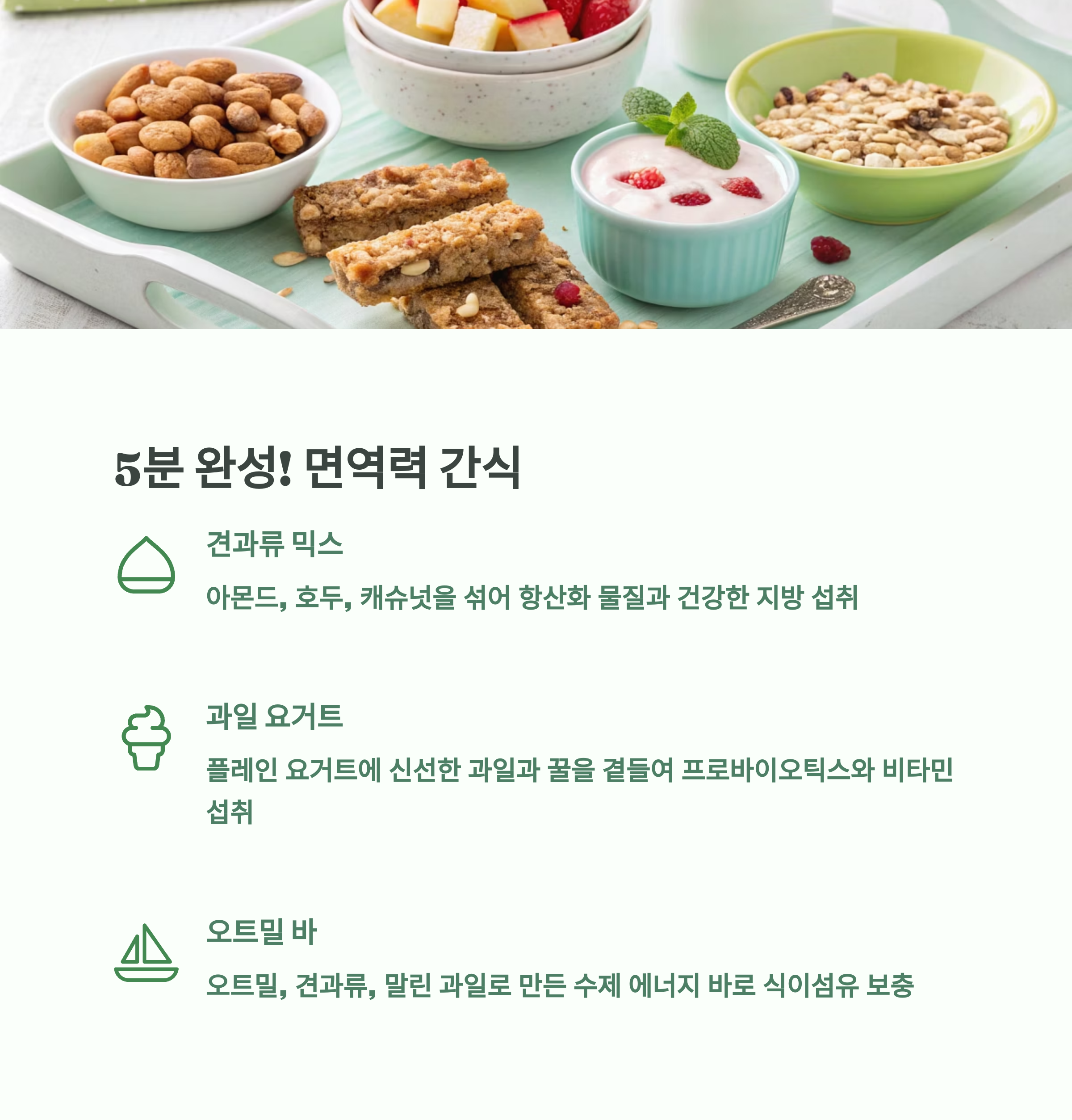 "간단한 건강 간식으로 면역력 강화에 필요한 영양소를 손쉽게 섭취할 수 있습니다."