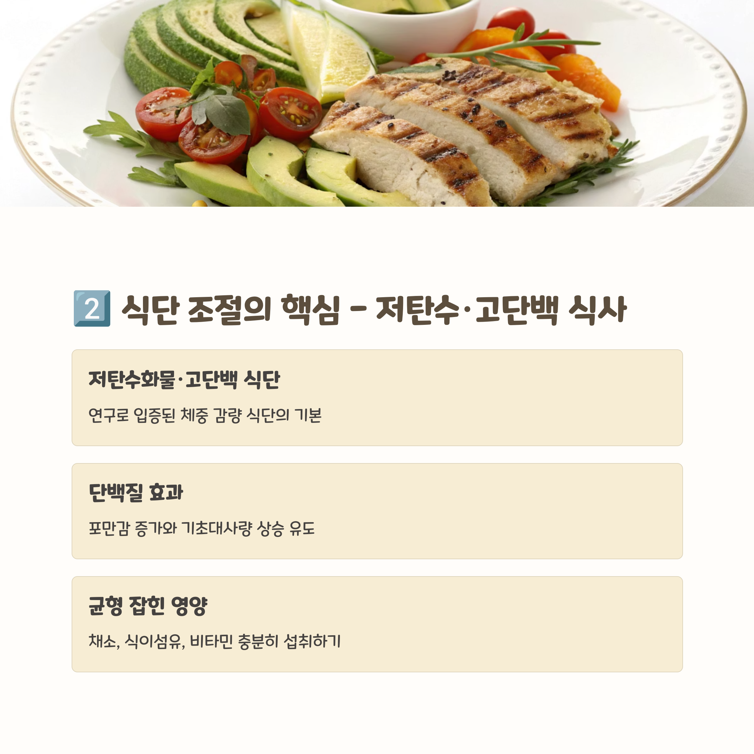 식단 조절 핵심 - 저탄수화물, 고단백 위주 구성