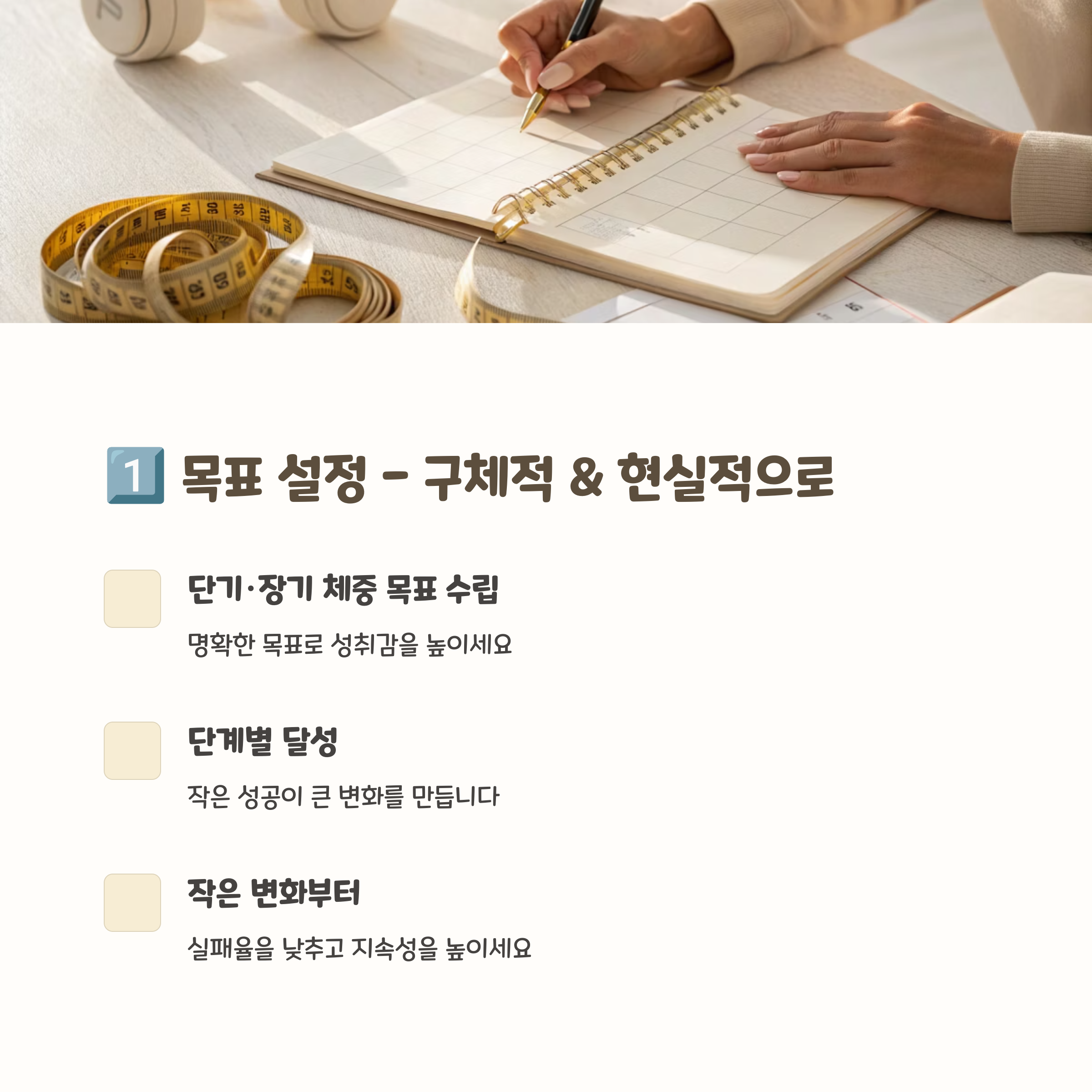 "5kg 감량"처럼 수치화된 목표를 세우고, 이를 달성하기 위한 기간도 구체적으로 설정하세요.