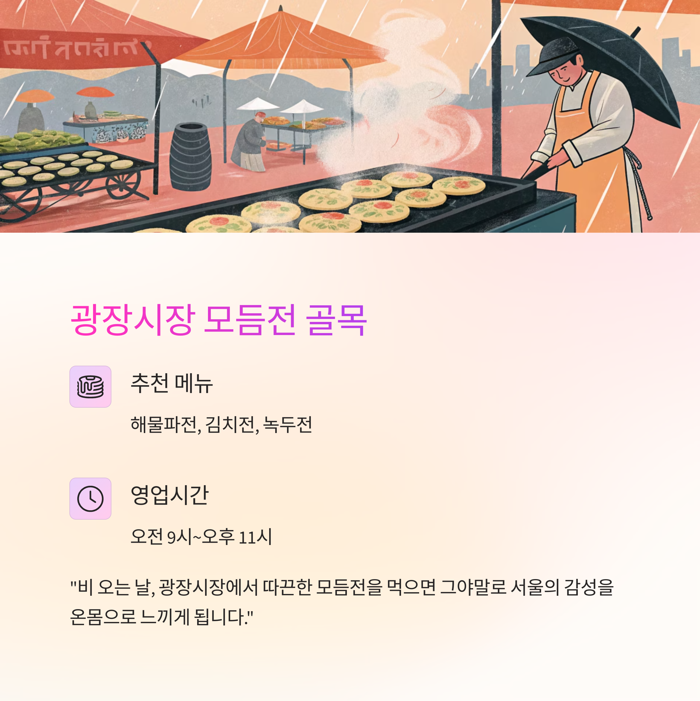 1. 광장시장 모듬전 골목 (현장감 스토리텔링)
