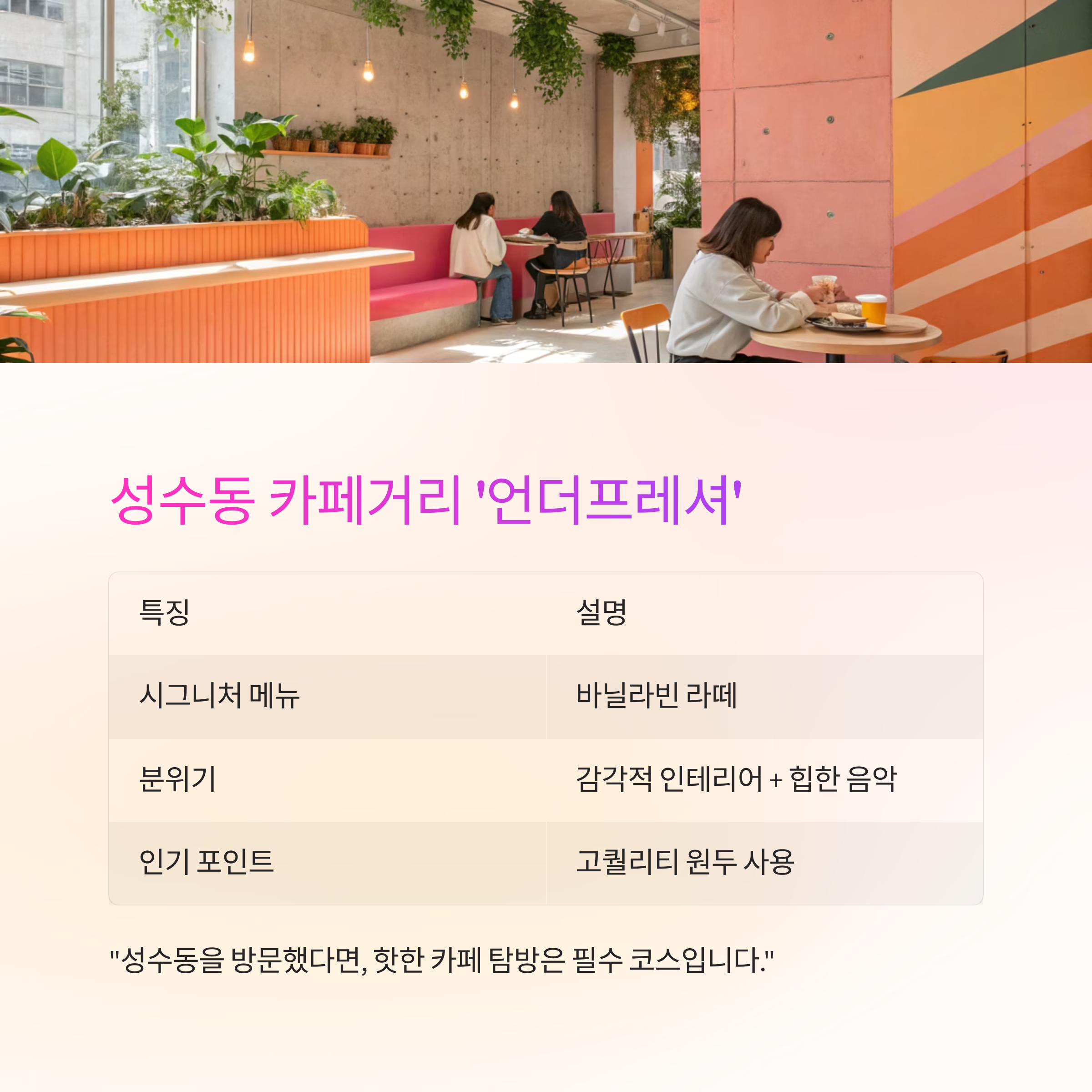 "성수동을 방문했다면, 핫한 카페 탐방은 필수 코스입니다."