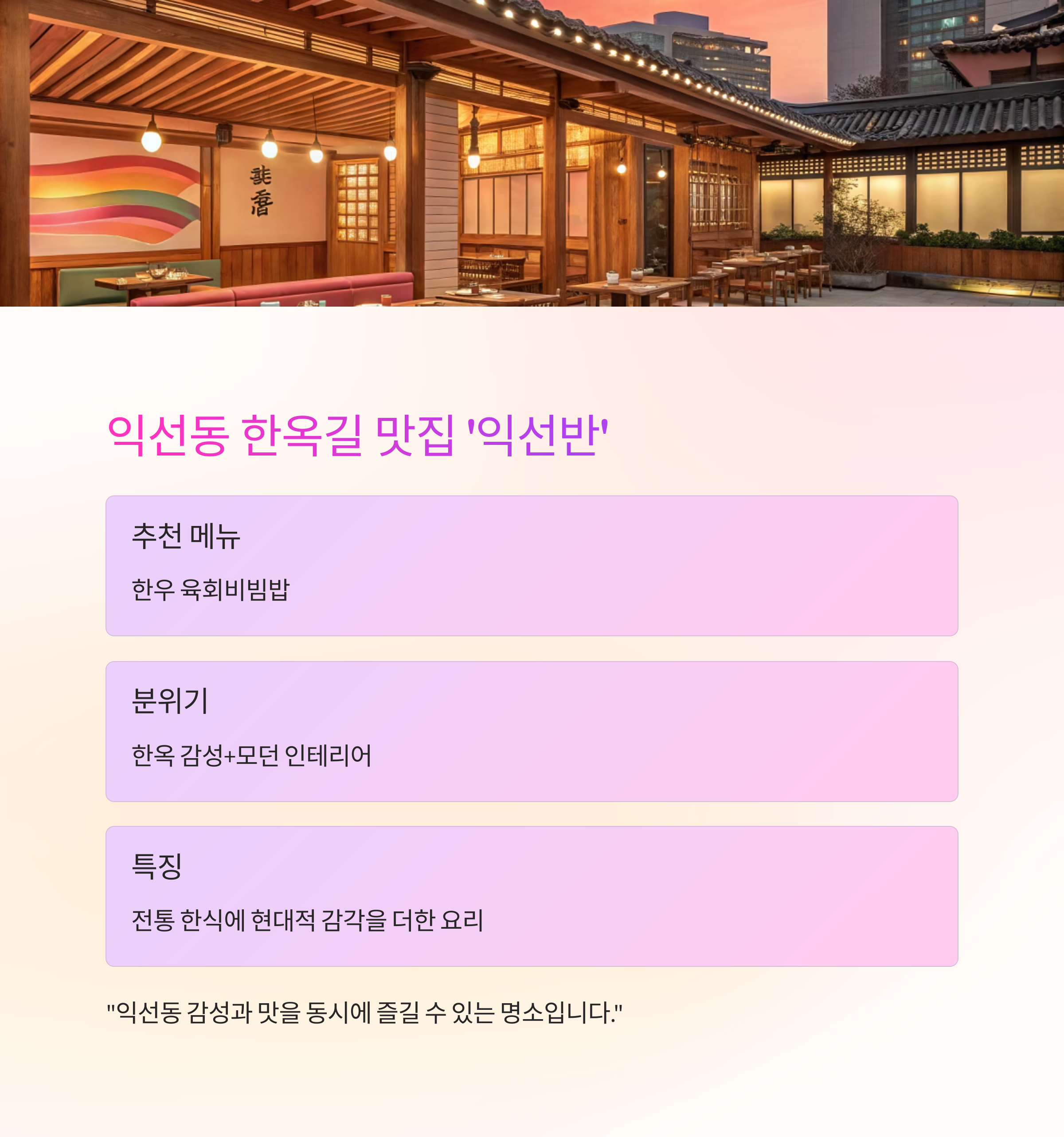 "익선동 감성과 맛을 동시에 즐길 수 있는 명소입니다."