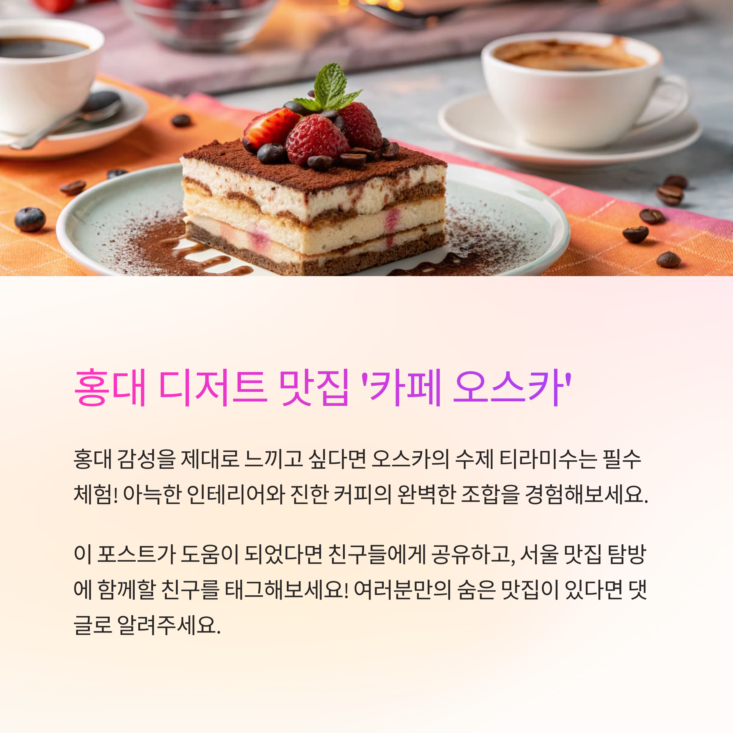 "홍대 감성을 제대로 느끼고 싶다면 오스카 티라미수는 필수 체험!"