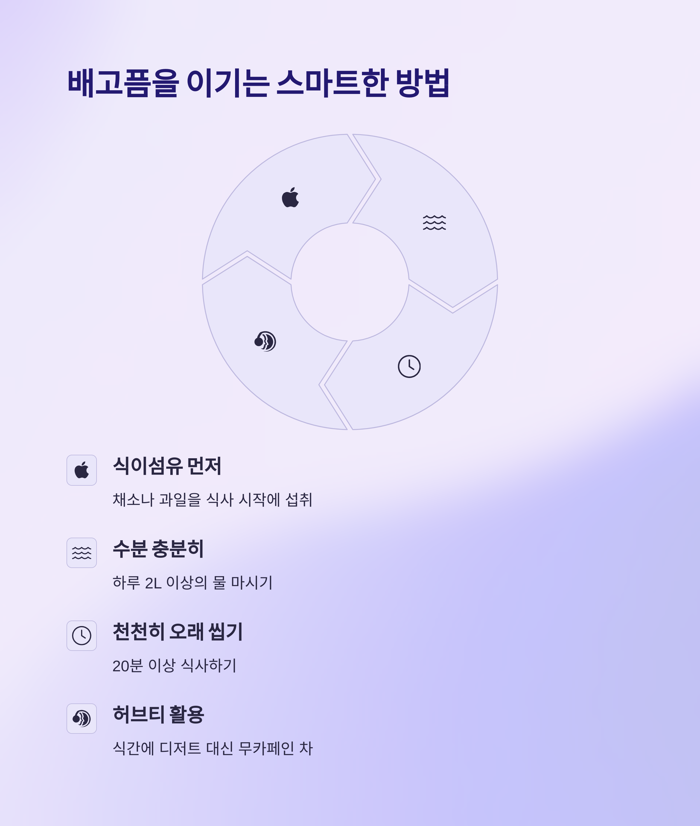 "섬유질과 단백질을 충분히 섭취하여 배고픔을 관리할 수 있습니다."