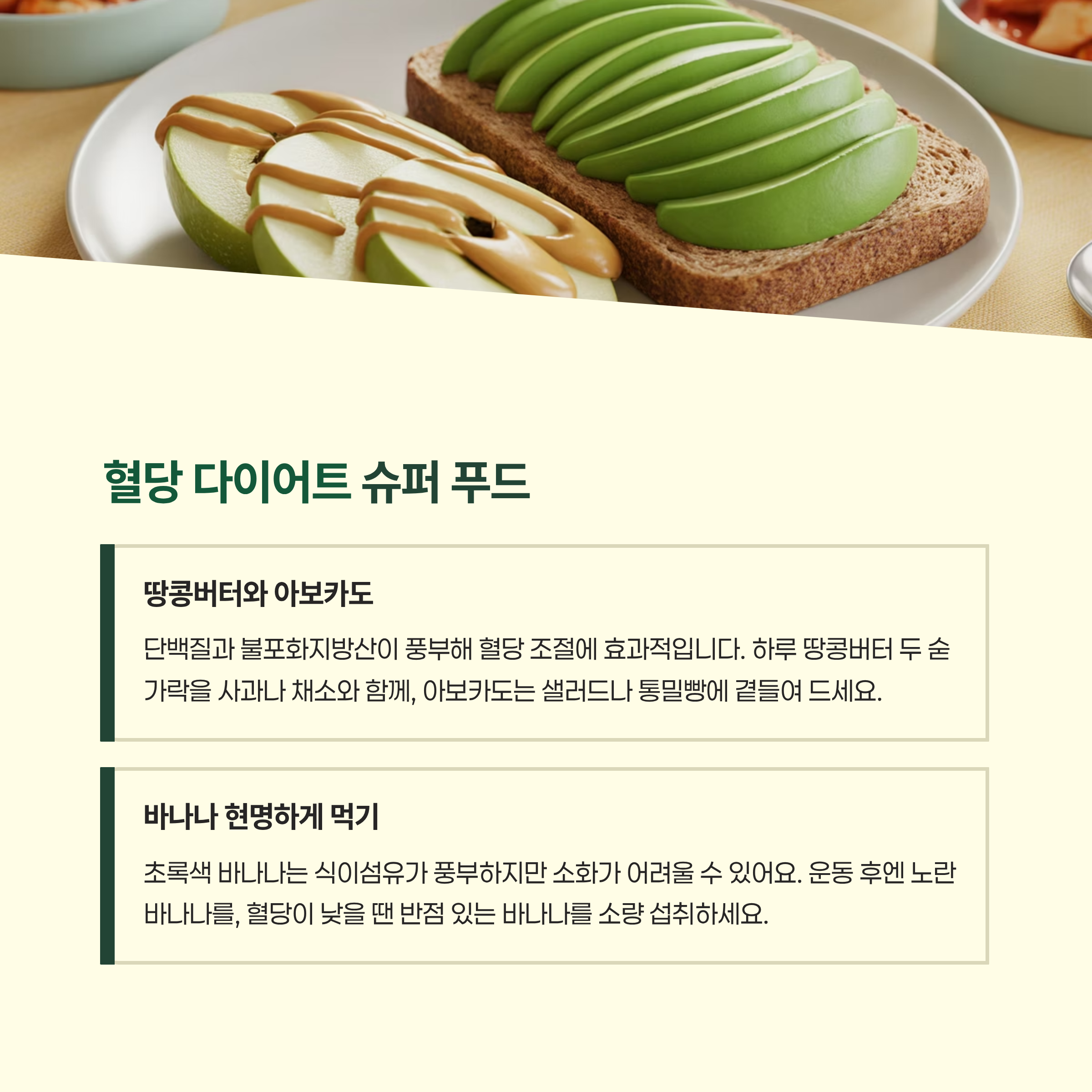 - 땅콩버터와 아보카도: 단백질과 불포화지방산이 풍부해 혈당 조절에 좋은 식품입니다.