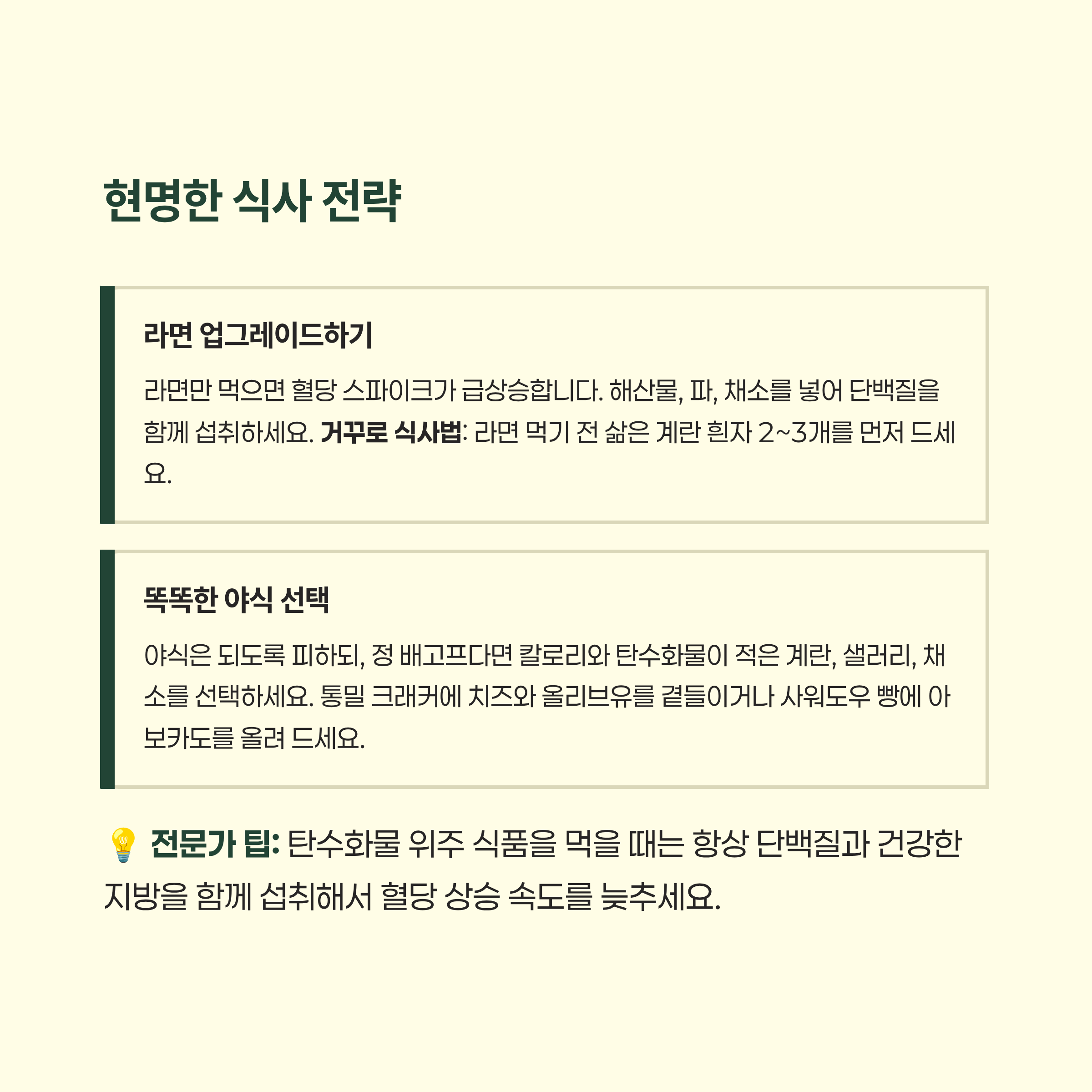 - 라면을 먹기 전 삶은 **계란 흰자 2~3개를 먼저 먹는 '거꾸로 식사법'**도 효과적입니다.