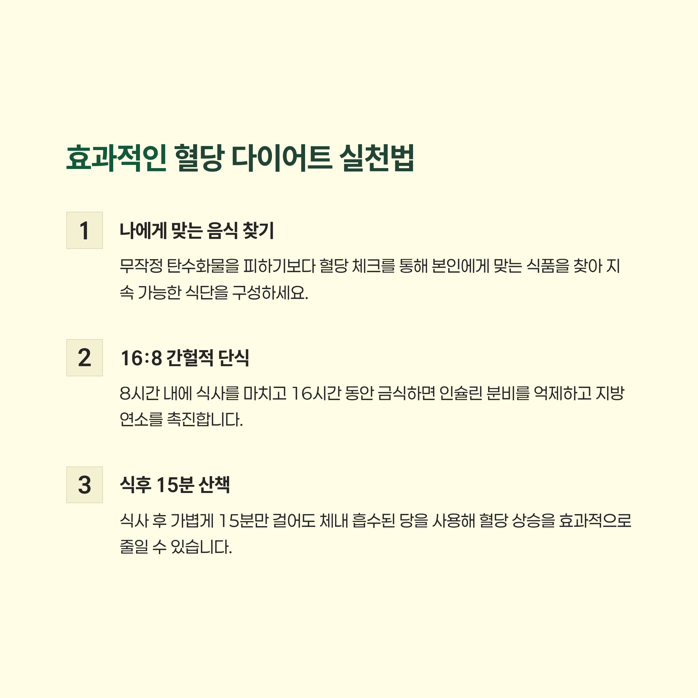 - 간헐적 단식: 16:8 간헐적 단식으로 인슐린 분비를 억제하고 지방을 태우도록 유도해 보세요.