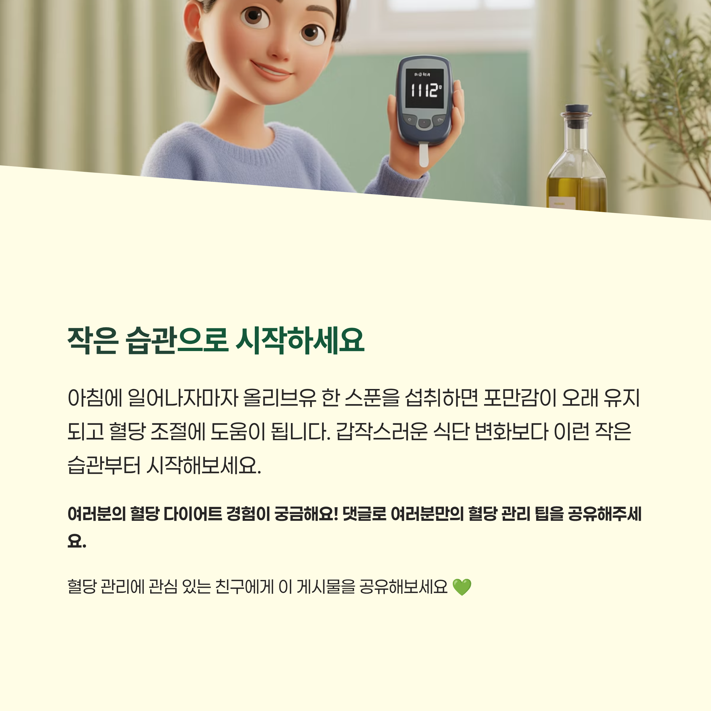 - 아침 공복 올리브유: 아침에 일어나자마자 올리브유를 먹으면 포만감이 오래 유지되고 혈당 조절에도 도움이 됩니다.