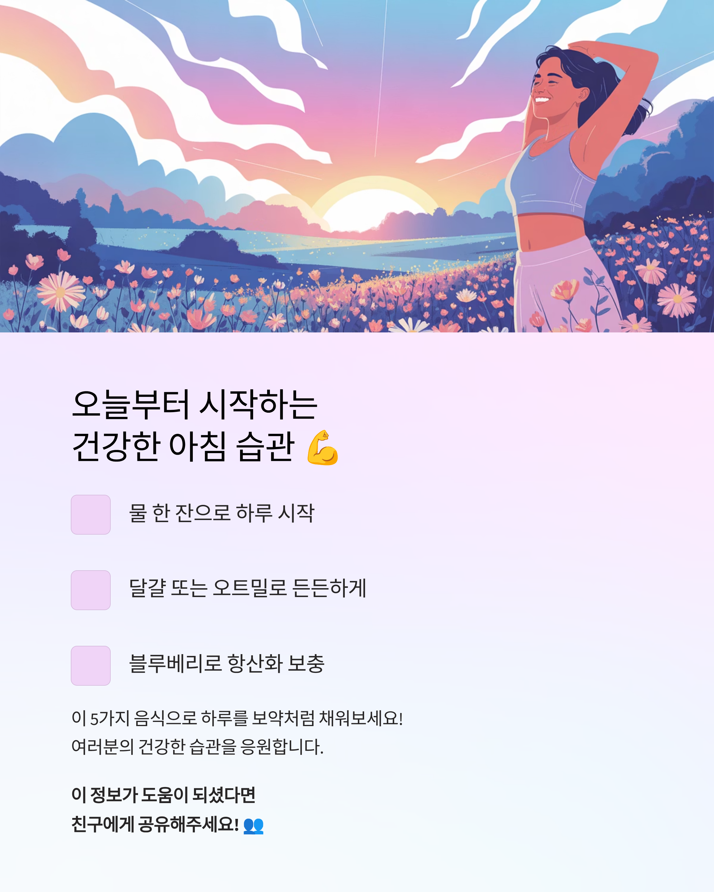 오늘부터 이 5가지 음식으로 하루의 시작을 보약처럼 채워보세요! 여러분의 건강한 습관을 응원합니다! 💪