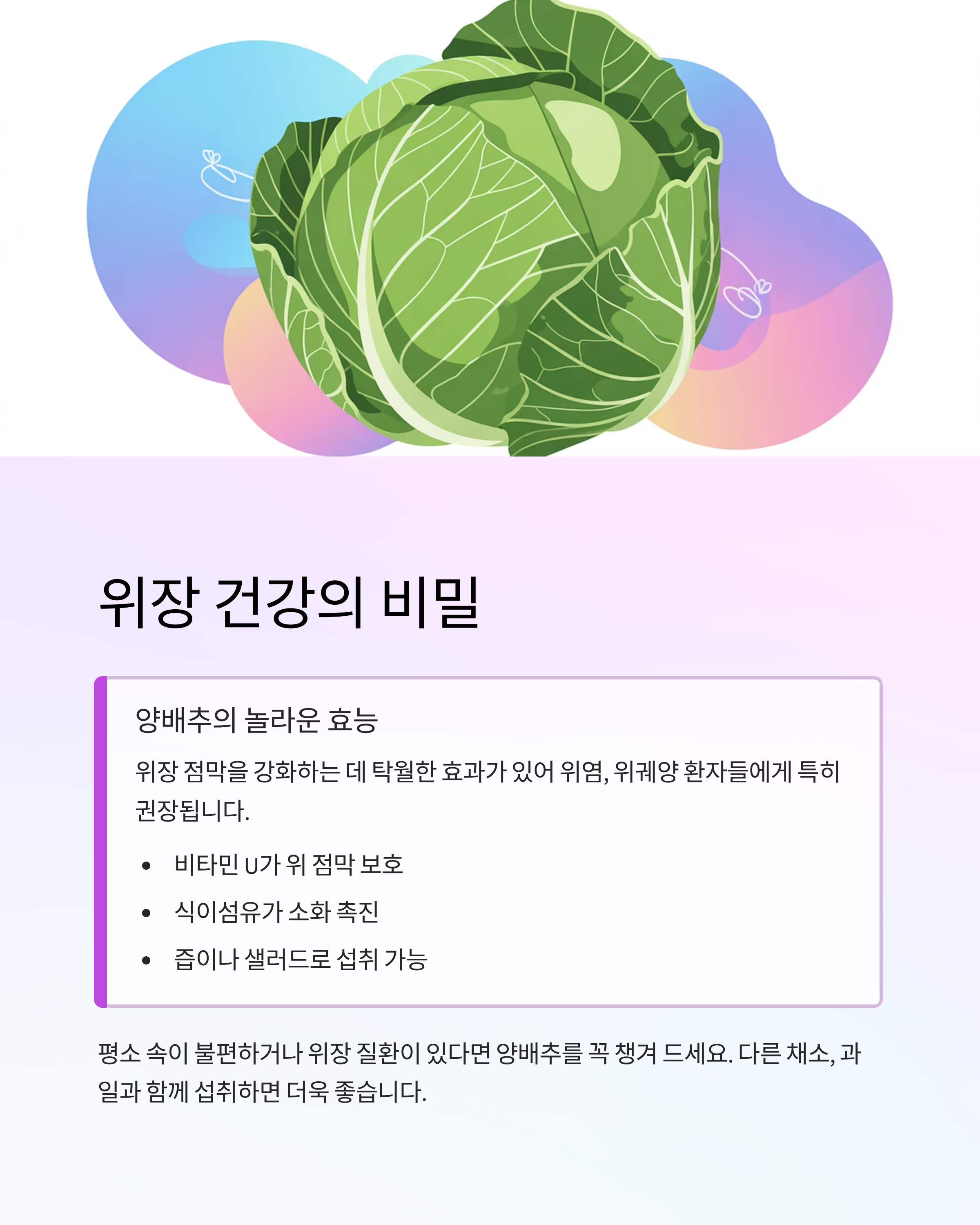 • 양배추는 위장 점막을 강화하는 데 탁월한 효과가 있어 각종 위장 질환 환자들에게 특히 권장됩니다.