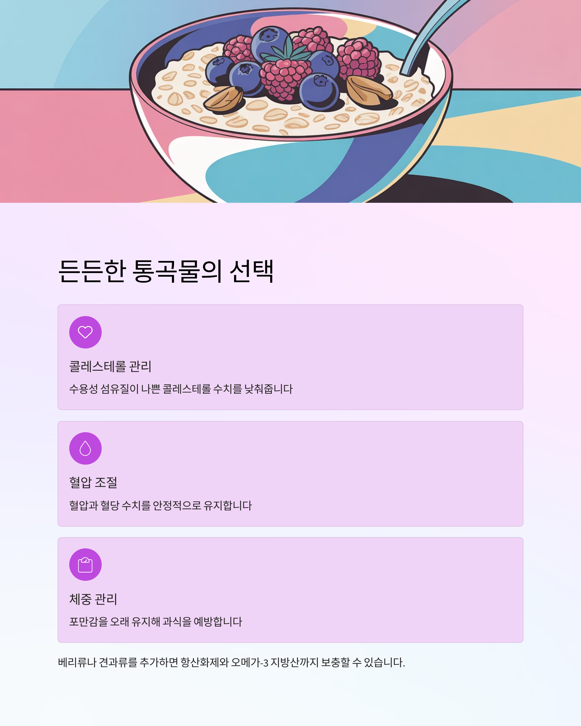 • 포만감을 오래 유지시켜 체중 관리에 유리하며, 베리류나 견과류를 추가하면 항산화제와 오메가-3 지방산까지 보충할 수 있습니다.