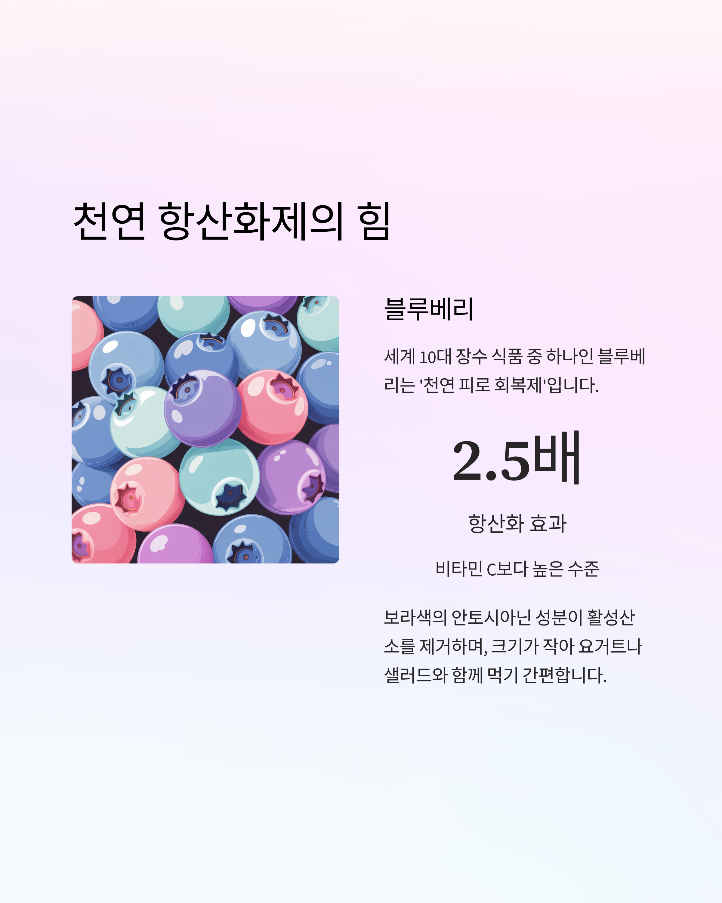 세계 10대 장수 식품 중 하나인 블루베리는 '천연 피로 회복제'라는 별명을 가지고 있을 만큼 강력합니다.