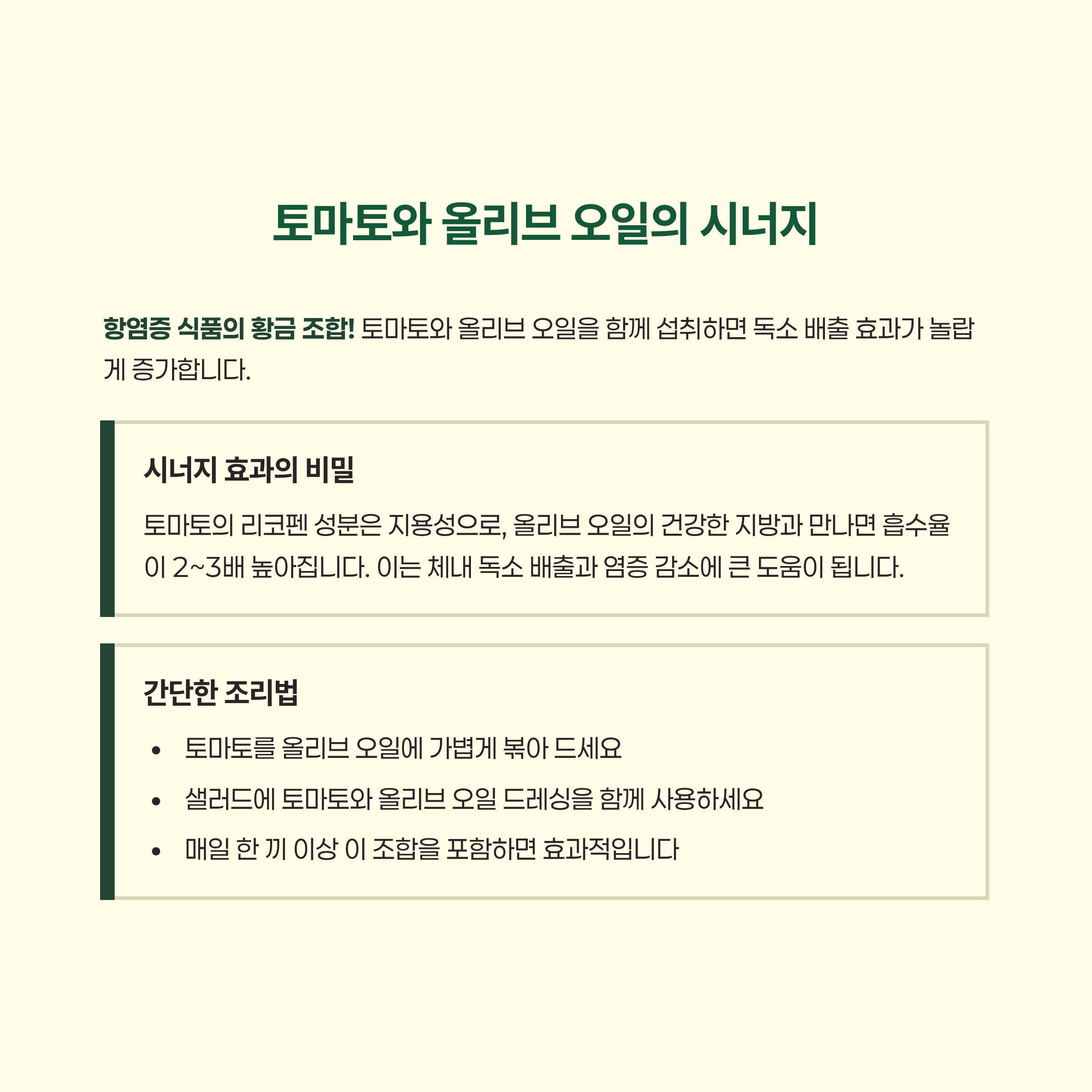• 특히, 토마토를 올리브 오일에 볶아 먹으면 독소 배출 효과가 2~3배나 증가한답니다